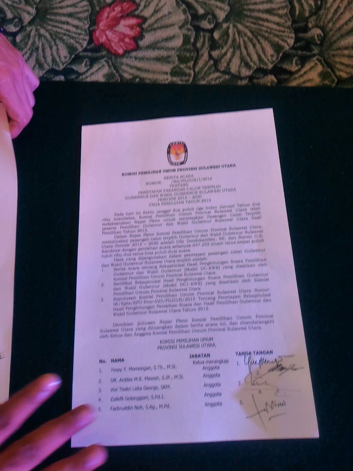 Pleno penetapan ini hanya dihadiri oleh Steven Kandouw selaku calon Wakil Gubernur terpilih, sementara Cagub Sulut terpilih Olly Dondokambey tidak menghadiri rapat pleno penetapan pasangan calon terpilih karena sedang berada di luar daerah. Sedangkan pasangan calon nomor urut 2 dan 3 tidak terlihat menghadiri rapat pleno tersebut.