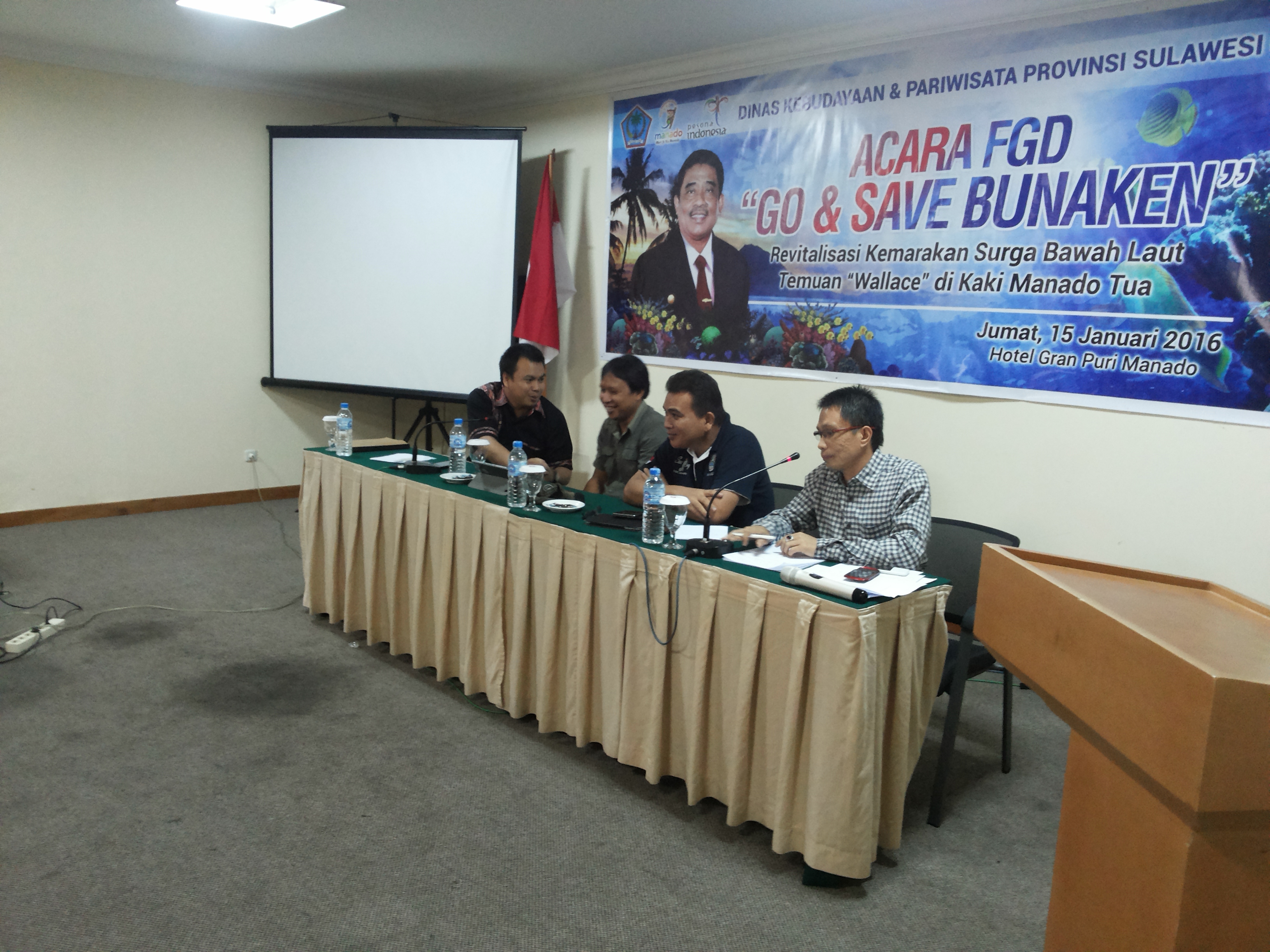 Acara kali ini bertema “Go & Save Bunaken: Revitalisasi Kemarakan Surga Bawah Laut Temuan “Wallace” di Kaki Manado Tua”. Yang menghadirkan Dr Ferol Warouw dari Akademisi sebagai Narasumber, Joy Happy Korah selaku Kepala Dinas Pariwisata dan Kebudayaan Sulut, serta Steven Sumolang, S.Sos, M.Si peneliti Antropologi Sosial sebagai Regulator.